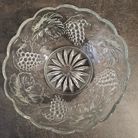 Myydään täysin ehjä lasikulho. Halkaisija noin 36,5 cm ja syvyys noin 7 cm.