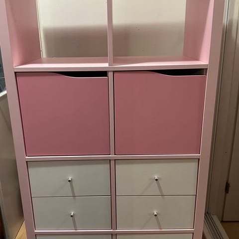 Hyllyssä ja laatikoissa käytön jälkiä, esim. muutama kohta, joihin hyllyyn on laitettu ruuveja. Muuten hyvässä kunnossa.