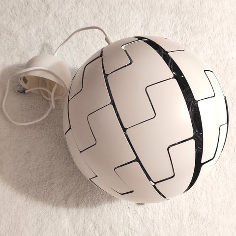 Myydään IKEA:n moderni kattovalaisin. Yksi paneeli on aiemmin irronnut, ja se on kerran liimattu takaisin. Valaisin pysyi hyvin katossa, mutta paneeli kaipaa vahvempaa liimausta tai pientä fiksausta (esim. kuumaliima tai muu vahvempi kiinnike voi toimia).