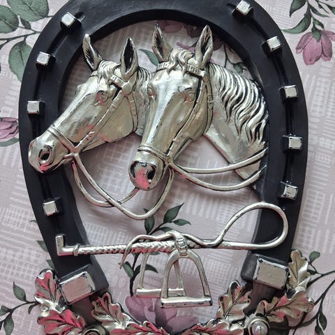 Kuvienmukainen kaunis hevosaiheinen seinäkoriste " Min bästa vän" teksti. Ei tietoa mitä materiaalia, painaa jonkin verran. Pientä maalipinnan kulumaa. Koko n.10cm ×15cm. Seinäkiinnitys takana.