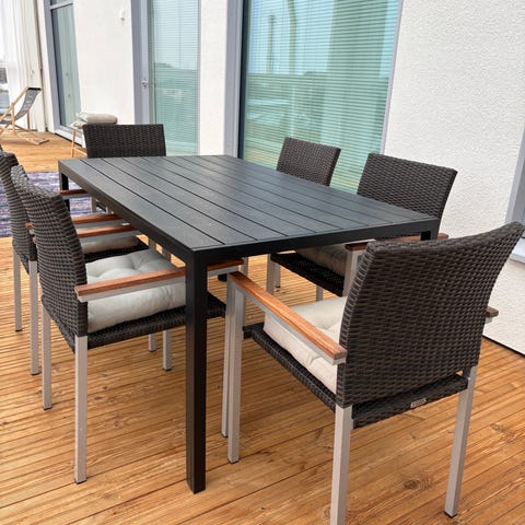 Iskun ulkoruokailuryhmä. Komposiittia eli huoltovapaa ja säänkestävä. Tukeva ja hyväkuntoinen.