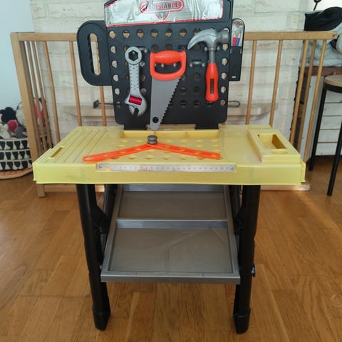 Pöytä ja työkaluja. Pöydän saa purettua osiin työkaluilla. Hyvässä kunnossa, joitakin ruuveja saattaa olla kadonnut.