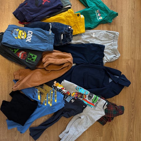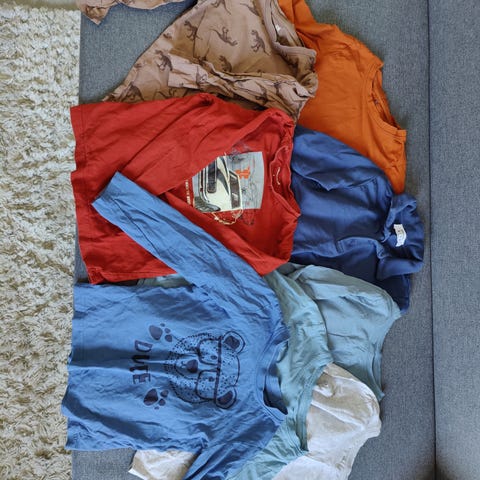 Myyn kuvissa olevan 5-6 vuotiaalle tarkoitetun vaatepaketin. Ollut vain yhdellä lapsella käytössä hyväkuntoisia vaatteita. Sisältää 4 shortsit, 2 neuletta, yhdet farkut, 4 yö-/ oloasua, hupparin ja pitkähihaisen teepaidan. Nallepaita on hieman nukkaantunut.
