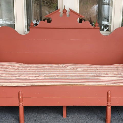Antiikkisohva kukkakuvioisella verhoilulla ja puukaiverruksilla