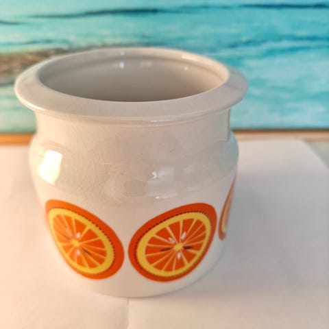 Arabian Keto posliinipurkki, jossa irrotettava kansi. Purkissa on kelta-oranssi kukkakuvio sivuilla ja kannen päällä, ja sisäpinta on valkoinen. Soveltuu esimerkiksi kuivien elintarvikkeiden, pienten keittiötarvikkeiden tai muiden pientavaroiden säilytykseen keittiössä tai muissa tiloissa. Suunnittelija Heini Riitahuhta.