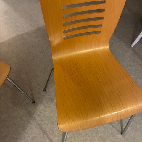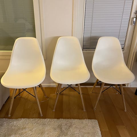 Myytävänä kolme ruokapöydän tuolia, 10e/kpl. Myydään ensisijaisesti sille, joka ostaa kaikki kolme tuolia.