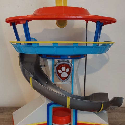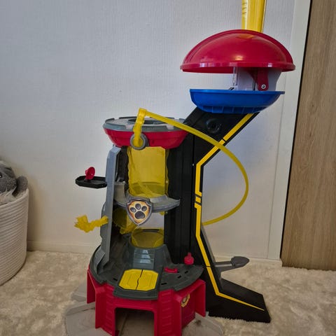 Ryhmä Hau leikkitorni, jossa on useita tasoja ja liukumäkiä ajoneuvoille tai hahmoille. Tornissa on katselutasanne, ramppimainen liukumäki sekä ajoreittejä molemmille puolille rakennetta. Leikkitorni sopii Ryhmä Hau -teemaisiin leikkeihin ja voidaan yhdistää sarjan ajoneuvoihin ja hahmoihin. Muovinen lelu, suunniteltu lasten leikkeihin sisätiloissa.