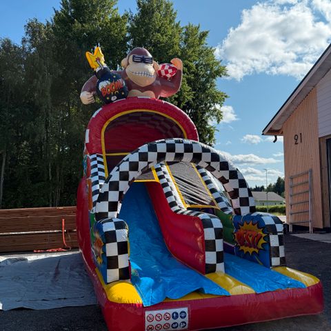 Hyväkuntoinen, tukeva liukumäki joko sisä- tai ulkokäyttöön. Leveys (jalat) 132 cm, korkeus 132cm, kokonaisliukumatka (ylhäältä alas) 210cm. Kahdessa askelmassa kulumaa.