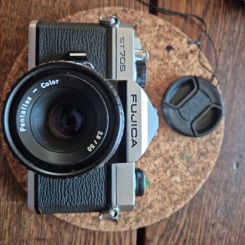Fujica ST701 filmikamera, josta puuttuu filminkelauskampi. filmin pyöritys takaisin toimii ilmankin, vaikka on vähän hankalaa. Erittäin hyvä Fujinon 1.8/55mm opiska, jonka tarkennus on vähän jäykkä. Toimii kuitenkin sekin.