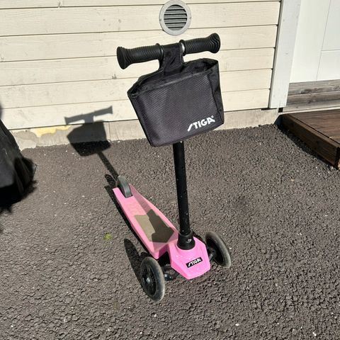 Takapyörän päällä kantapäällä painettava jarru. Ohjaustangossa irrotettava koripussukka. Tankoa voi säätää muistaakseni kolmeen korkeuteen.