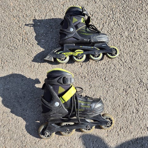 Hyväkuntoiset koon 33-36 lasten rullaluistimet ja suojukset (polvi+kyynärpää+ranne)