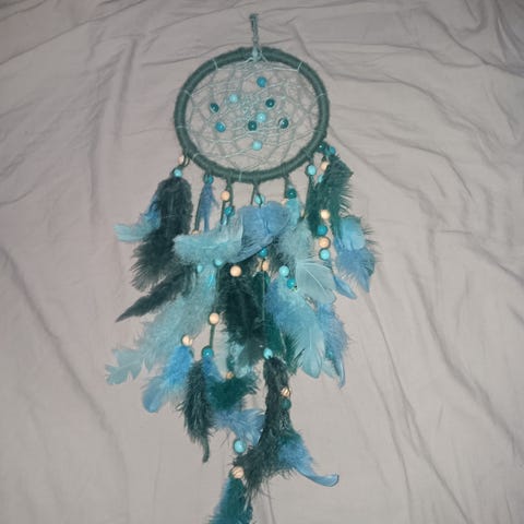 Iso unisieppari, joka on päällystetty beigellä narulla ja keskellä on verkkomainen kuvio. Koristeessa roikkuu höyheniä ja helmiä, jotka ovat pääosin vaaleita ja ruskeansävyisiä turkooseilla helmillä. Sopii sisustuselementiksi esimerkiksi makuuhuoneeseen tai olohuoneeseen seinälle ripustettavaksi.
