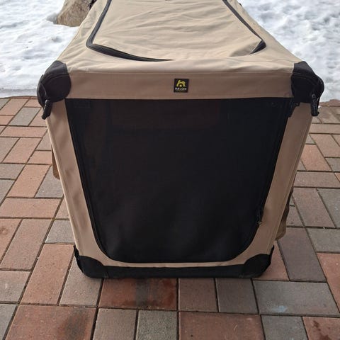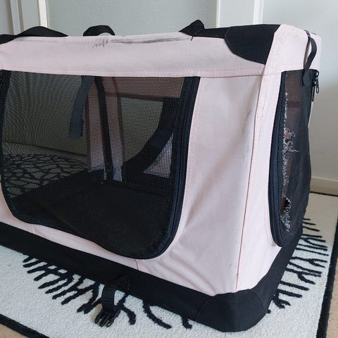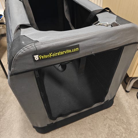 Punainen kevythäkki pienelle koiralle. Mitat: korkeus 50cm, pituus 70cm, leveys noin 45cm. Pari pientä reikää, niistä kuvat mukana. Ei priima mutta asiansa ajava. Nouto Salokylä, tuonti omien menojen mukaan Liperi/Ylämylly.