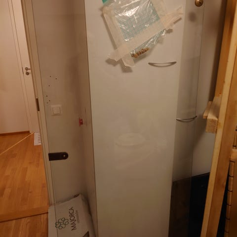 Savuharmaalla lasilla. Karmin ulkomitat 69cm x 189cm. Karmin alareunaan kiinnitetty rima kuljetuksen ajaksi.