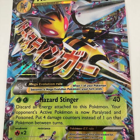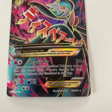 Pokémon Mega Steelix EX -keräilykortti. Kortin etupuolella näkyy Mega Steelix EX -hahmo ja hyökkäys Canyon Axe. Kortin taustapuolella pinta osittain vaurioitunut. Holo /rare.