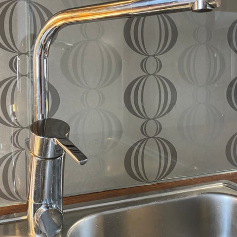 Keittiöhana, jossa korkea kaareva juoksuputki ja yksivipuinen sekoittaja. Pintakäsittelynä kromi. Hana soveltuu keittiöaltaaseen tai kodinhoitohuoneen altaaseen. Liitäntäputket näkyvissä kuparisina, hana asennetaan työtasoon tai altaan reunaan yhden reiän kautta.
