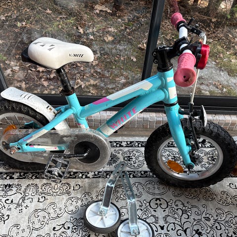 Hyvässä kunnossa oleva lasten White myynnissä. Ollut kaksi kesää käytössä ja todella hyvässä kunnossa. Mukaan apupyörät ja talutus tuki.