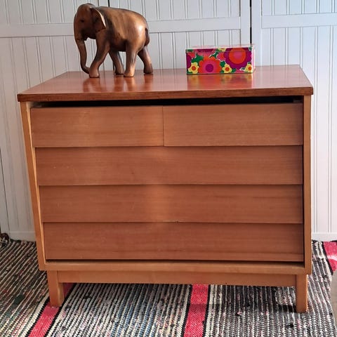 Isku lipasto kaappi yhdistelmä, jossa on puuviilupintainen taso sekä vaalea runko. Ollut kirjoituspöytä, mutta taso lyhennetty kuvan mukaiseksi. Vasemmalla puolella on neljä vetolaatikkoa, oikealla puolella kaappi hyllyillä.