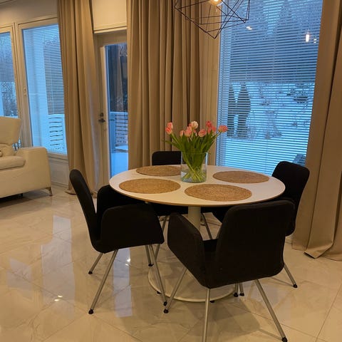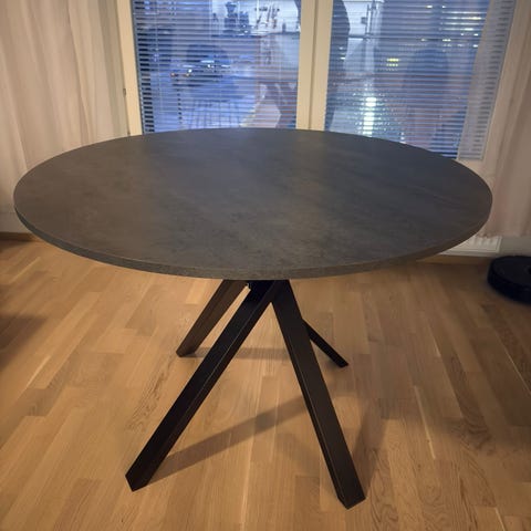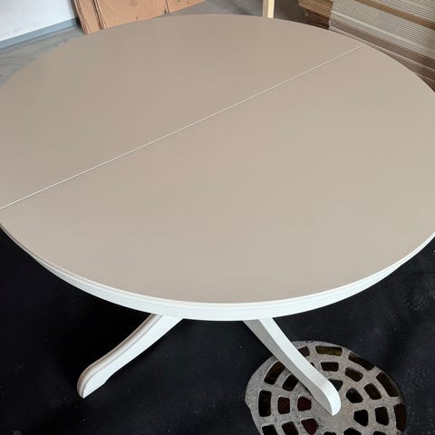IKEA jatkettava pyöreä ruokapöytä valkoisena. Pöydässä on yksi keskijalka, josta lähtee neljä jalkaa tukemaan pöytää. Pöydän kansi on jaettu kahteen osaan, ja pinnassa voi on käytön jälkiä, kuten naarmuja. Kunto kuitenkin suht hyvä. Sopii ruokailu- tai oleskelutilaan useamman istumapaikan pöydäksi. Ikää pöydällä 6,5v.