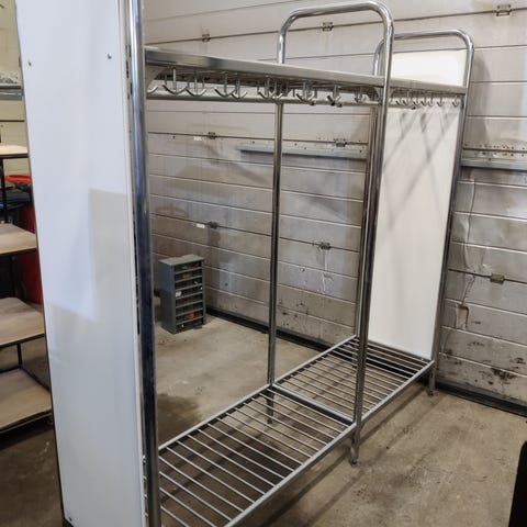 Tukeva metallirakenne, pyörivä kruunuosa ja runsaasti koukkuja.
