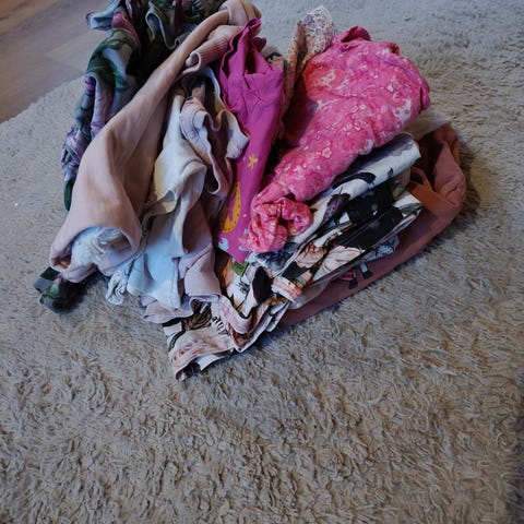 Lasten vaatepaketti tytöille, koko 92. Pakettiin kuuluu useita erivärisiä ja -kuvioisia vaatteita, kuten housuja, paitoja, ja mahdollisesti mekkoja. Vaatteet ovat kirjavaa värimaailmaa, joukossa vaaleita, tummia ja pastellisävyjä sekä kuviollisia vaatteita. Sopii noin 92 cm pituiselle lapselle. Paketti sisältää arkeen sopivia vaatteita