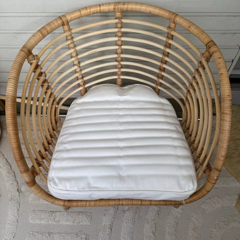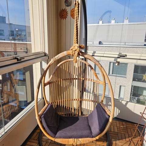 Ikean Rådviken rottinki-/lepotuoli. Pinnassa näkyy hieman käytön tuomaa kulumaa, mutta ehjä ja suht hyväkuntoinen.