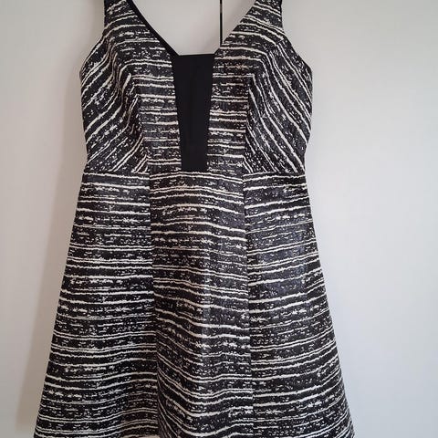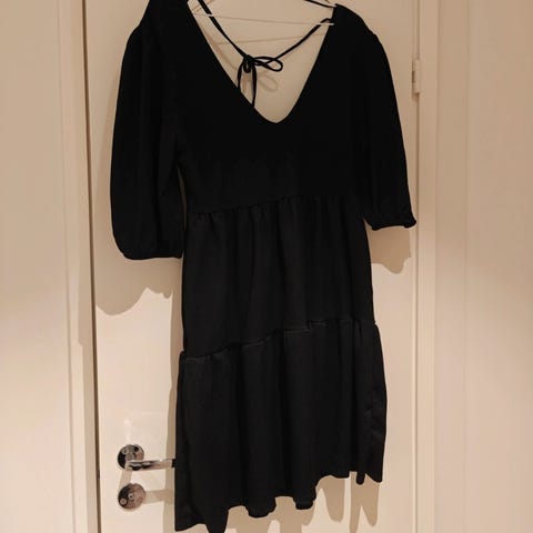 Myytävänä uusi, pikku musta mekko. Kaunis V -kaula-aukkoinen, putous mallinen pääntie. Koko: L. 65% puuvillaa ja 35% polyesteria. Ulottuu hieman polven yläpuolelle.