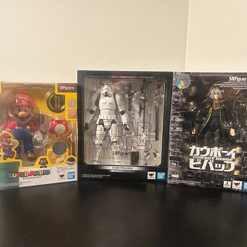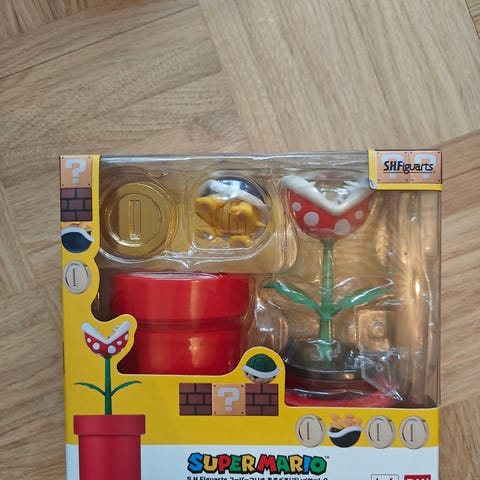 Bandai S.H.Figuarts Super Mario Luigi -toimintahahmo. Pakkauksessa Luigi-hahmo ja useita vaihdettavia osia, kuten käsiä ja esineitä.