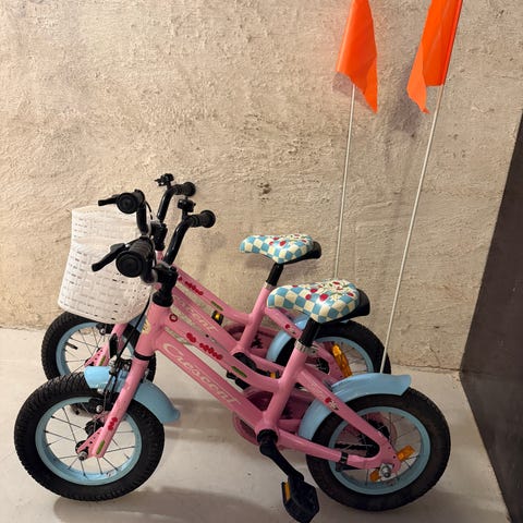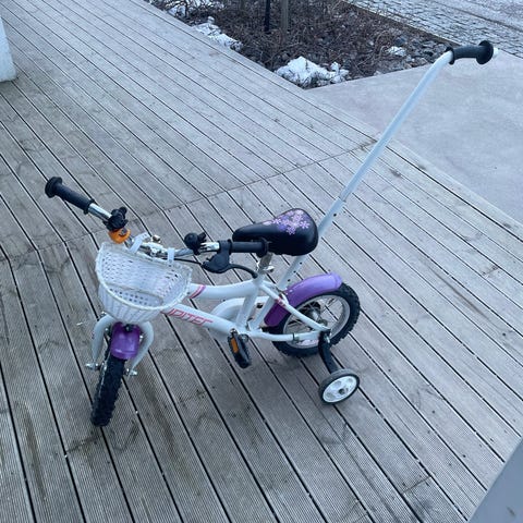 Yhden kauden käytössä ollut Bits lasten polkupyörä, jossa 12" renkaat. Rungon pääväri on valkoinen ja yksityiskohdat vaaleanpunaisia. Pyörässä on jalkajarru sekä takana työntöaisa aikuisen avustamista varten. Myös apupyörät löytyvät tarvittaessa mukaan.