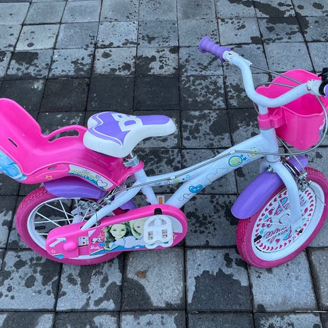 Frog lasten polkupyörä luullakseni 14" renkailla. Rungon väri on valkoinen, jossa on monivärisiä pilkkuja. Pyörässä on matala runko, suora ohjaustanko ja jalkapolkimet heijastimilla. Satula on musta ja korkeussäädettävä. Sopii noin 3-4v lapselle. Pyörällä on ajettu paljon, mutta kunto edelleen hhvä käytetty. Toinen jarru lapsen makuun kuulemma hieman jäykkä, mutta aikuisen mielestä toimii sekin. Renkaisiin vaihdettu uudet ulkokumit ennen viimeisintä käyttäjää.