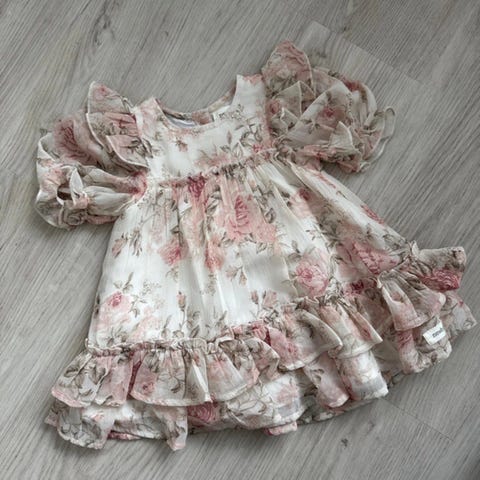 Newbie-kukkamekko vauvalle, koko 68 / 4-6 kk. Herkkä kukkakuviointi ja kaunis malli. Laput kiinni, käyttämätön.