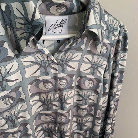 Uusi vuorellinen Eila Helenin mekko. Vaalealla pohjalla harmaansävyisiä kuvioita. Pitkä vetoketju selkäpuolella. Koko 38. Vain nouto.