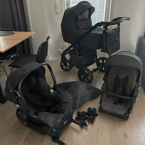 Mukaan tulee: Runko, vaunukoppa, ratasosa, hoitolaukku sekä adapterit, mitkä meillä sopi Joien kaukaloon.