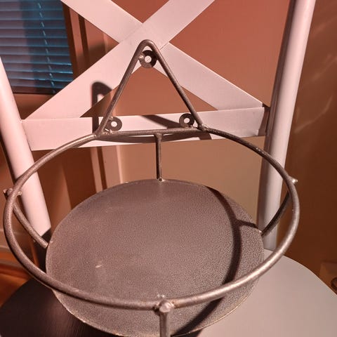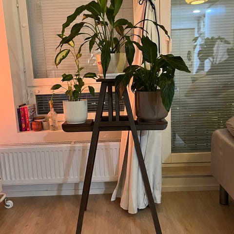 Myydään vihreä kukkateline. Siinä kolme hyllyä. Mukana kukka- amppeli. Yhteensä 5 e.