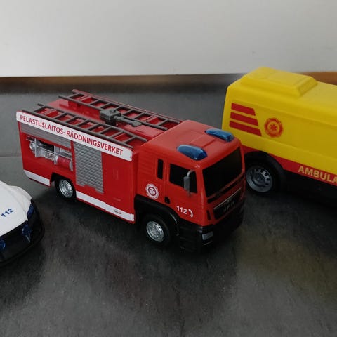 Myydään lasten leluautot settinä: ambulanssi ja pattereilla toimiva poliisiauto, johon tulee äänet ja valot. Patterit ei mukana.