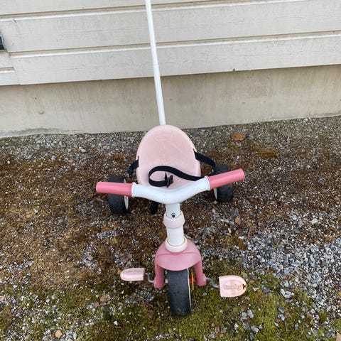Lasten kolmipyörä 10" renkailla. Pyörässä on turkoosi-musta istuin ja kuomu, työntöaisa aikuisen ohjaukseen sekä polkimet etupyörässä. Kolmipyörässä on selkänojallinen istuin turvakaarella ja jalkatuilla pienemmälle lapselle. Takana on pieni tavarakori. Soveltuu pienille lapsille potkuttelu- ja ajoharjoitteluun aikuisen valvonnassa.