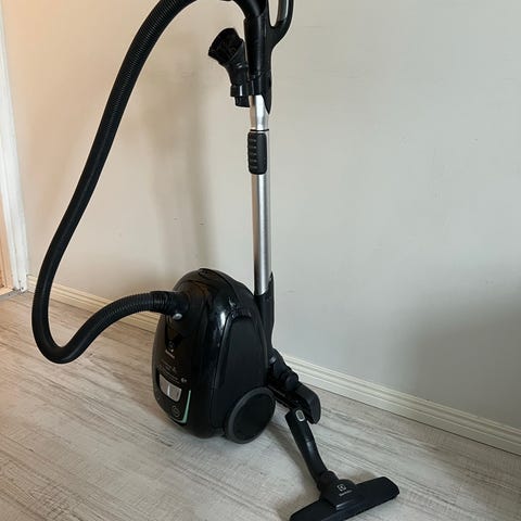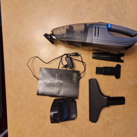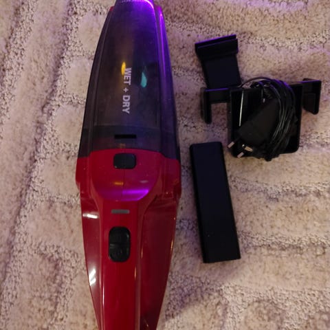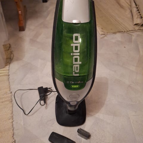 Pölynimuri on toimintakunnossa, latausasema mukaan lukien. Pölysäiliö on helppo purkaa ja puhdistaa. Rungossa on joitakin naarmuja.