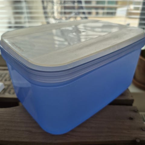 Tupperware muovinen säilytysastia, jossa erillinen ritiläkansi ja aluslautanen. Astia on suorakaiteen muotoinen ja vaaleansävyinen. Ritiläkansi mahdollistaa ilman kierron, mikä sopii esimerkiksi elintarvikkeiden tai muiden tavaroiden säilytykseen jääkaapissa tai keittiössä. Materiaali on kestävää muovia ja astia on tarkoitettu yleiseen säilytyskäyttöön kotitaloudessa.
