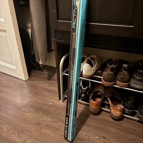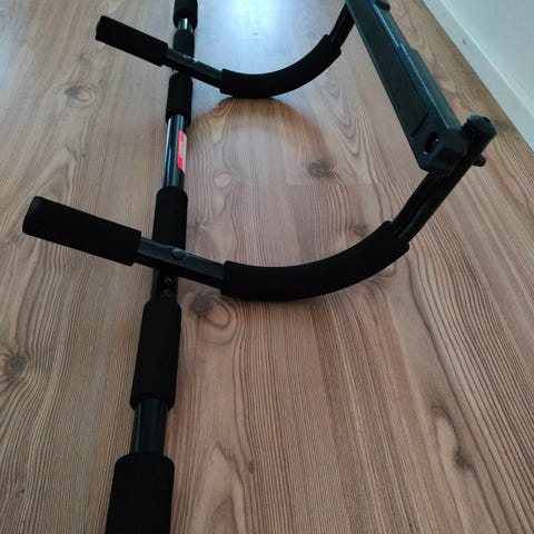 Säädettävä metallinen leuanvetotanko oviaukkoon. Tangossa on musta pinnoite ja pehmustetut otepinnat. Kiinnitys tapahtuu kiristämällä tanko oviaukon karmien väliin ilman erillisiä ruuveja. Täysin uutta vastaava kunto.