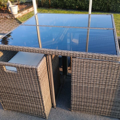 Tuolit 4+2 pehmusteineen saa kaupan päälle. Tuoleista 4kpl ok kunnossa, mutta 2kpl tuolien nojasta polyrottinki -punos lähtenyt purkaantumaan (2 viimeistä kuvaa).