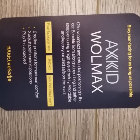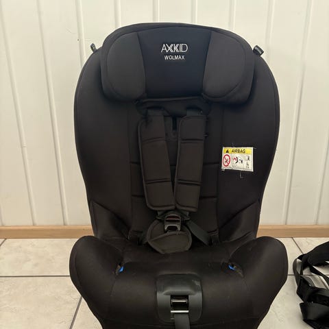 Mummolassa hyvin vähäisellä käytöllä ollut Axkid Wolmax turvaistuin, painoluokka 9–25 kg. Istuimessa on viisipistevaljaat ja se kiinnitetään auton kolmipisteturvavyöllä sekä tukijalan ja lisäkiinnitysvöiden avulla. Malli on tarkoitettu käytettäväksi selkä menosuuntaan. Pääntuki ja valjaat ovat säädettävät lapsen koon mukaan. Verhoilu on musta ja pehmustettu, ja sen voi irrottaa puhdistusta varten. Turvaistuin soveltuu käytettäväksi useissa eri automalleissa, kunhan auton turvavyön pituus ja kiinnityspisteet ovat ohjeiden mukaiset.