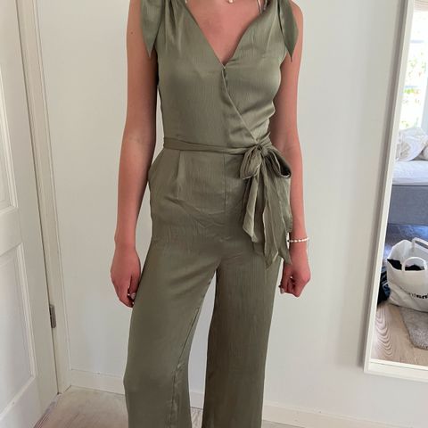 Kerran käytetty Esprit naisten jumpsuit, koko 36. Hihaton malli, musta väri ja viskoosimateriaali. Vyötäröllä kuminauha, taskut, selässä vetoketju ja nappi, kapenevat lahkeet. Yläosassa pitsiyksityiskohtia edessä ja takana. Sopii käytettäväksi arki- ja juhlapukeutumisessa. Olka-nilkka pituus noin 147 cm. Koiratalous.
