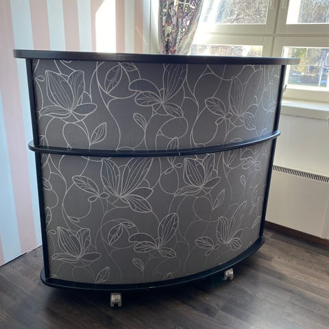 Myydään valkoinen, metallinen myyntitiski / liukuovikaappi ilman avainta. Toisella puolella avointa hyllytilaa ja toisella puolella säilytystila kahdella liukuovella. Nouto Helsingin Töölöstä.