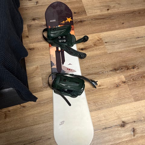 Lumilauta siteineen, 161 cm. Melko jäykkä, eli toimii vauhdikkaammassakin menossa. Kulumaa on, ja nose aikanaan delaminoitunut ja liimattu takaisin kasaan. Liimauksen jälkeen ollut ainakin pari viikonloppureissua käytössä ilman moitteita.