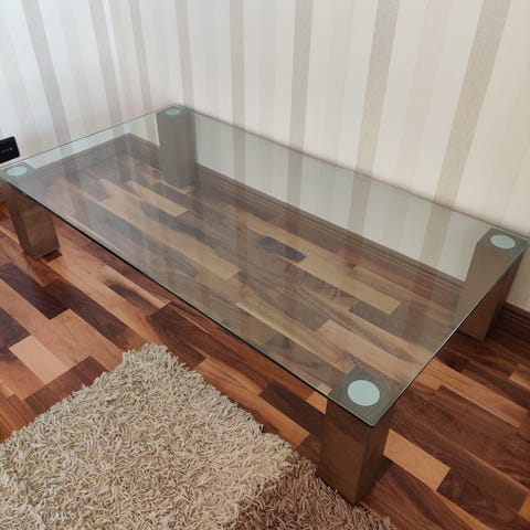 Valkoinen sohvapöytä, lasikansi ja kaksi vetolaatikkoa, joissa lasi pohjalla. Siisti kunto, vain muutama pieni kolhu.