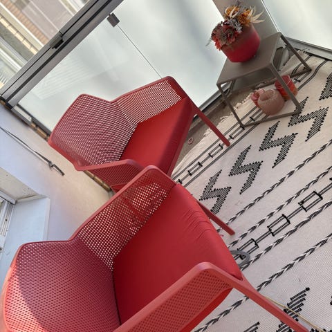 Musta terassituoli ja -penkki narumaisella istuin- ja selkäosalla. Tuolissa pyöreä, ovaalinmuotoinen istuinosa ja metallirunko. Penkissä suorakaiteen muotoinen istuinosa samalla narurakenteella ja metallijalustalla. Sopii ulkokäyttöön esimerkiksi parvekkeelle tai terassille.