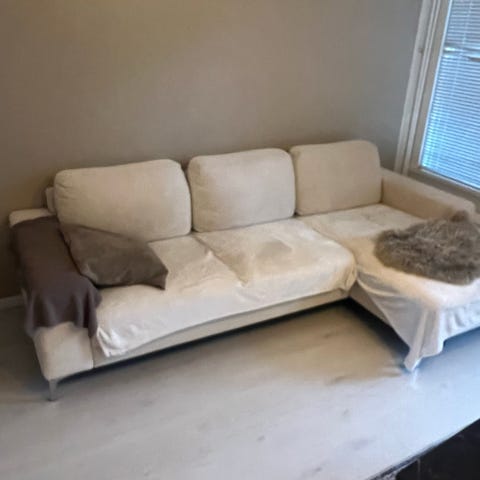 Vaalea sohva, myydään pois muuton alta. Käsinojissa kankaassa väri kulunut. Divaanin voi laittaa myös toiseen reunaan. Pehmeä istua. Nouto ja omat kantajat mukaan. Ei kovin painava