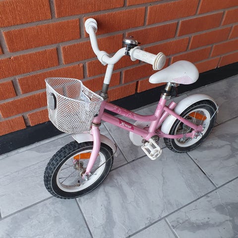 Yosemite lasten polkupyörä 12" renkailla. Pyörässä on vaaleanpunainen runko, valkoiset lokasuojat ja ketjusuoja sekä satula, jossa on vaaleanpunaisia kuvioita. Etujarru käsijarrulla, polkimet ja heijastimet edessä ja takana. Sopii pienelle lapselle ensimmäiseksi polkupyöräksi, kun käytössä on 12 tuuman rengaskoko.