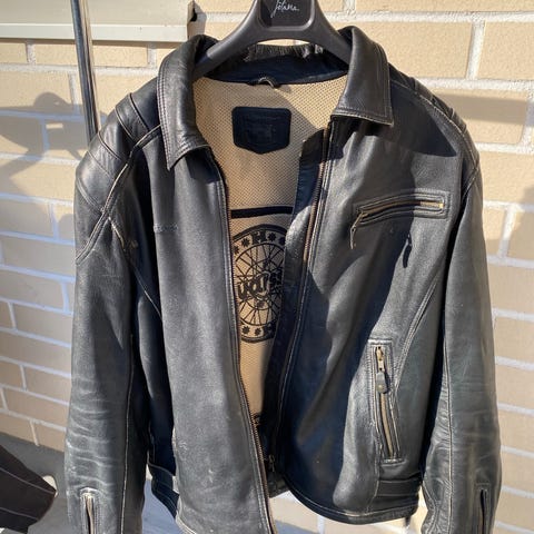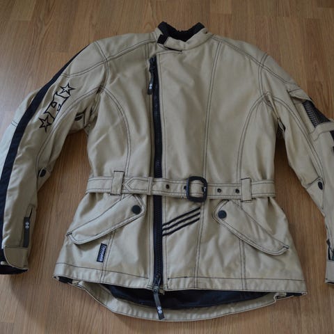 Halvarssons ajotakki. Väri musta vaaleilla tereillä. Edessä useita vetoketju- ja läppätaskuja. Takissa on korkea kaulus ja vetoketjukiinnitys, jonka päällä on neppilista. Selässä ja sivuilla säätöremmit istuvuuden säätämiseen. Nouto Hertsikan metriksen vierestä, mp ok.