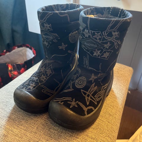 Lumi Kuoma lasten talvikengät, koko 26. Kengän sisäpituus 17.4cm. Väri musta harmaa army kuvio. Unisex-malli, joka sopii sekä tytöille että pojille. Kengissä on paksu, kuvioitu kumipohja ja varressa kuviollinen päällinen. Soveltuvat kylmään säähän ja ulkoiluun. Pitävät hieman kosteutta. Kantapää jo kulunut, mutta oivat käyttökengät vielä hoitoon. Mukaan myös punaiset lisäpohjalliset. Nouto Ylämyllyltä. Postit ostajalle. Koiratalous. MMM.